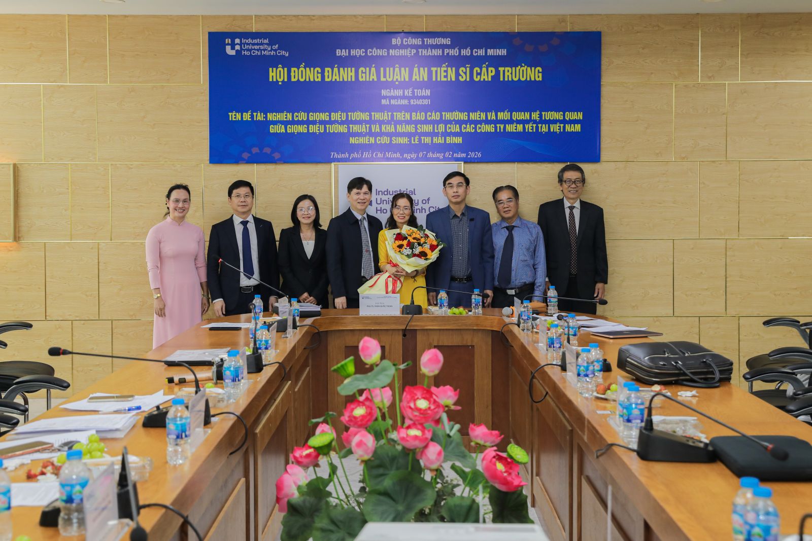 Ngày 07/02/2026, Trường Đại học Công nghiệp TP. Hồ Chí Minh đã tổ chức buổi bảo vệ luận án tiến sĩ cho nghiên cứu sinh Lê Thị Hải Bình với đề tài: “Nghiên cứu giọng điệu tường thuật trên báo cáo thường niên và mối quan hệ tương quan giữa giọng điệu tường thuật và khả năng sinh lợi của các công ty niêm yết tại Việt Nam”.